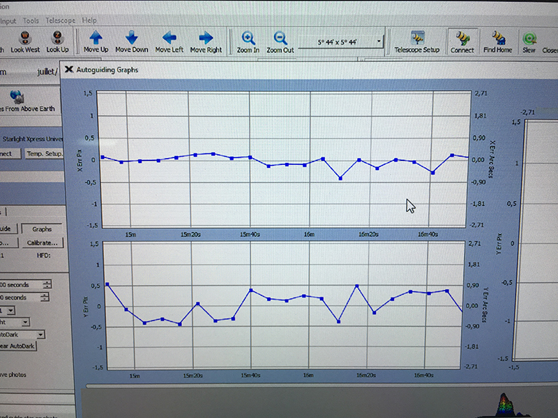 20 Juillet 2016 : Première session J'ai profité d'un ciel presque clair sur toute la France pour lancer un test grandeur nature du Remote. N'ayant pas installé le CloudWatcher je ne souhaite pas prendre de risques, ni rester éveillé toute la nuit à surveiller le ciel sur la All-Sky. Dans "l’euphorie" de la soirée, car quand tu lances pour la première fois Maxpilote en session et qu'en plus, le setup n'est pas dans le jardin, le coeur en prend un petit coup ! ![]() Brute de 600s H-Alpha SANS Autoguidage avec MAP sur filtre L : ![]() L'autoguidage qui fonctionne : Un petit Zoom sur les données d'autoguidage : C'est la première fois que je peux tester la FSQ106 avec l'ATLAS en condition réelle (MES OK / Monture bien réglée et autoguidage OK). |
